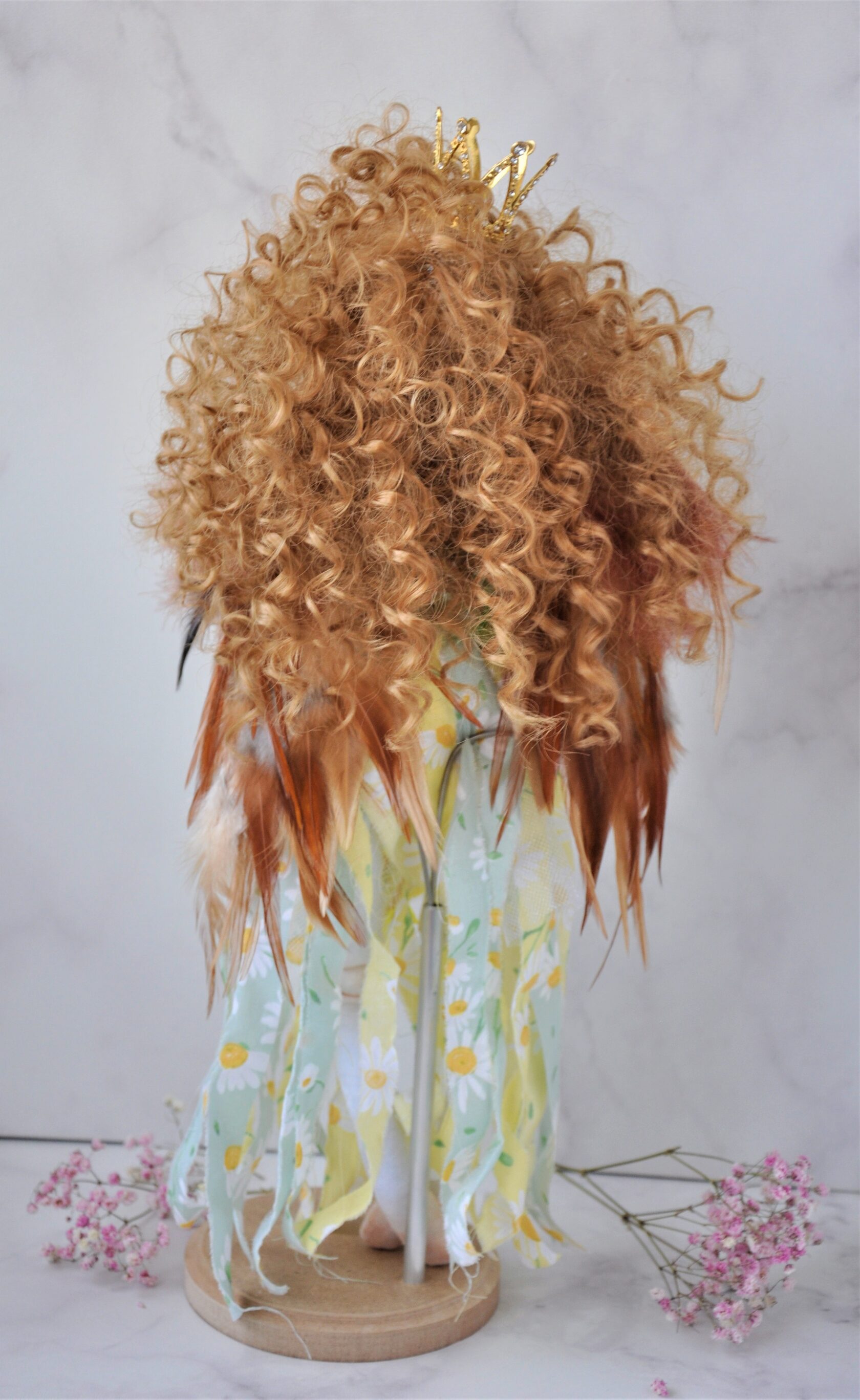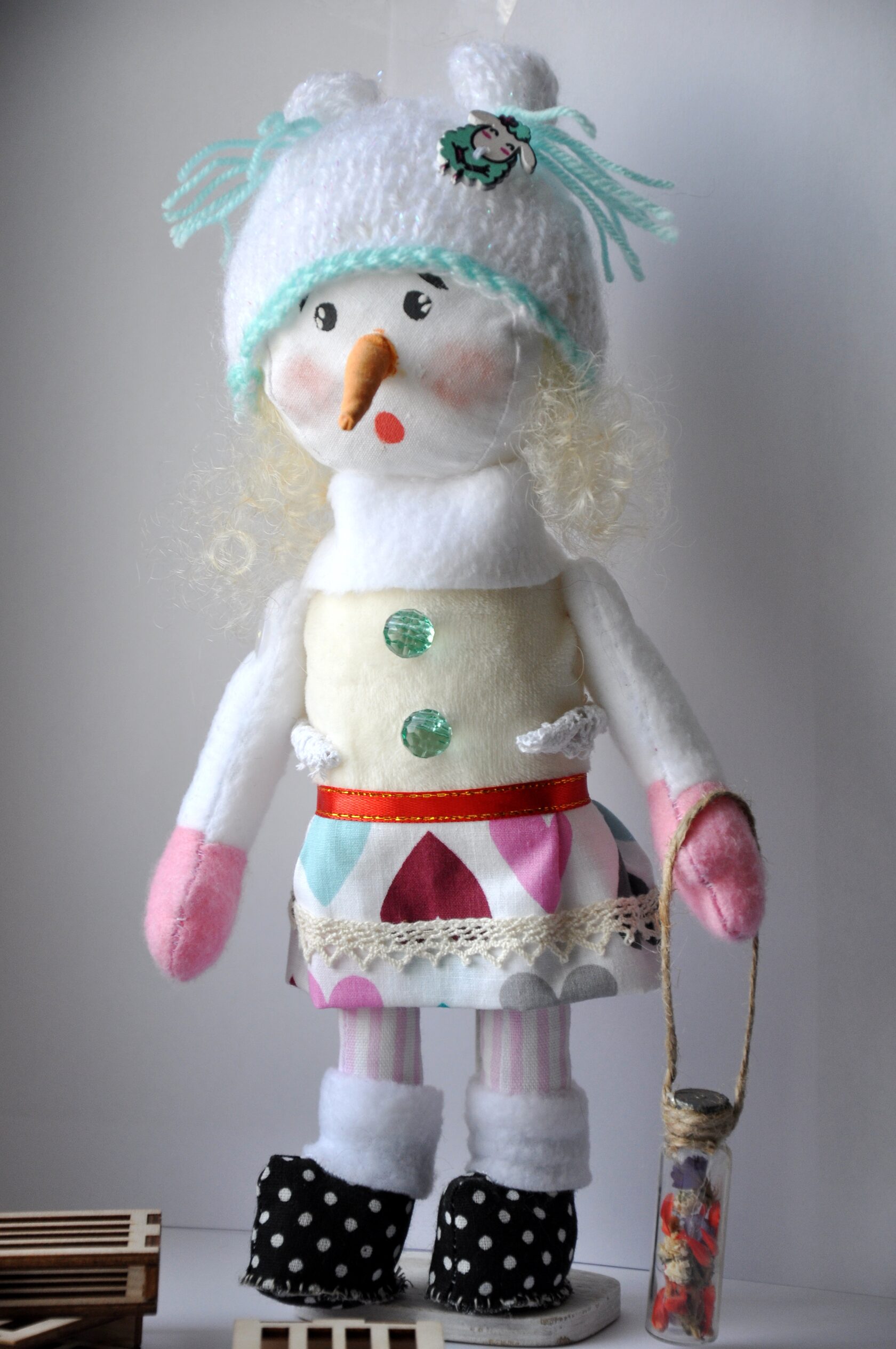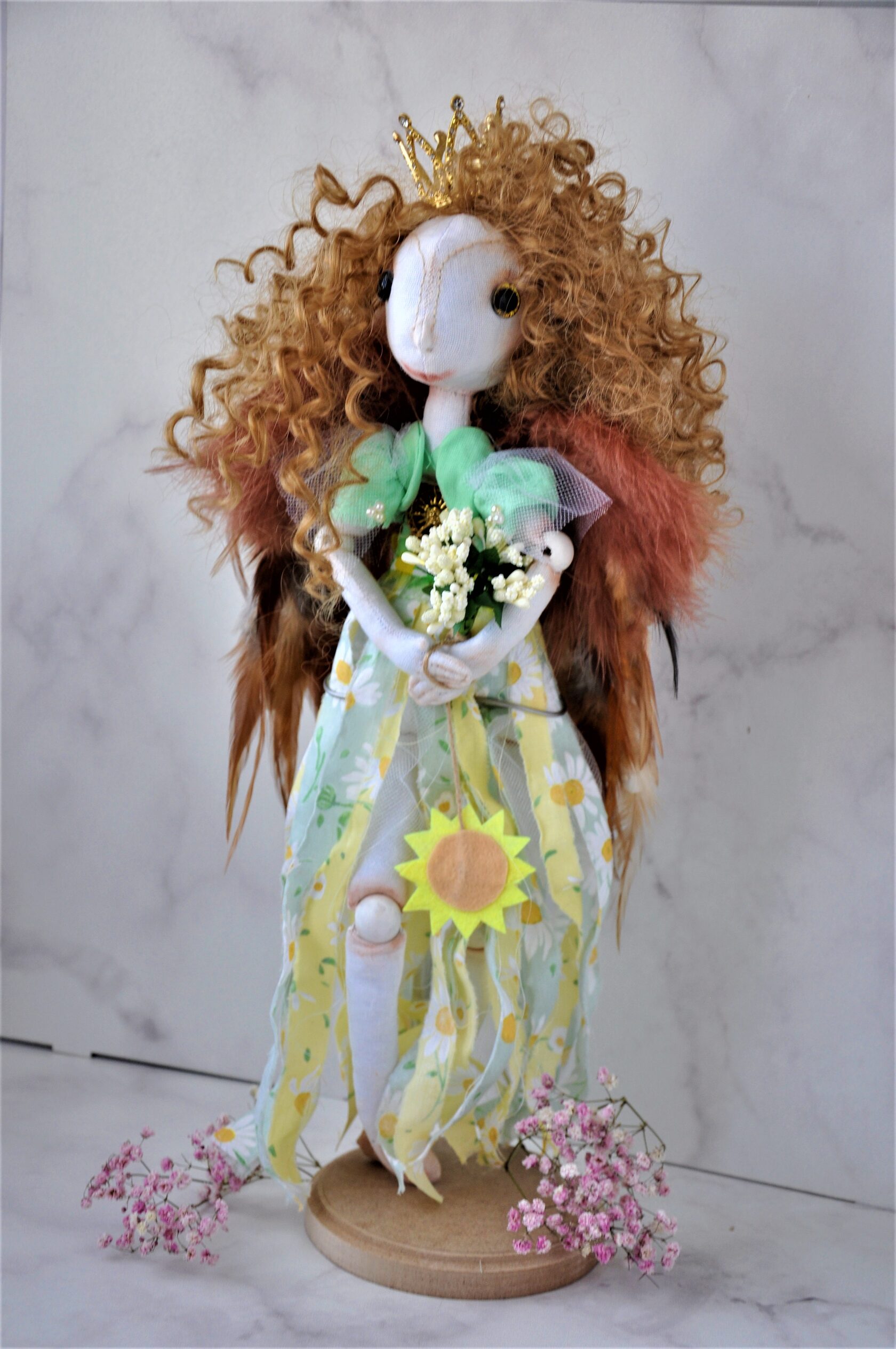 Руки и ноги на шарнирах из деревянных бусин. В комплекте идет подставка, чтобы держать куклу в вертикальном положении. Рост 38 см. Упакована в красивую коробку с лентой.